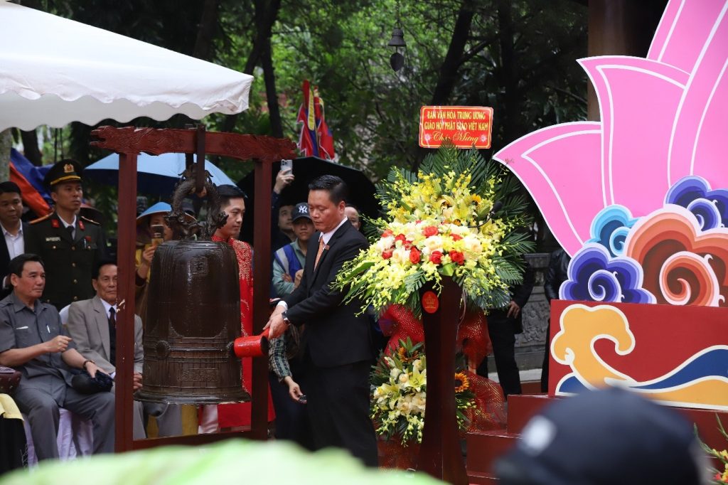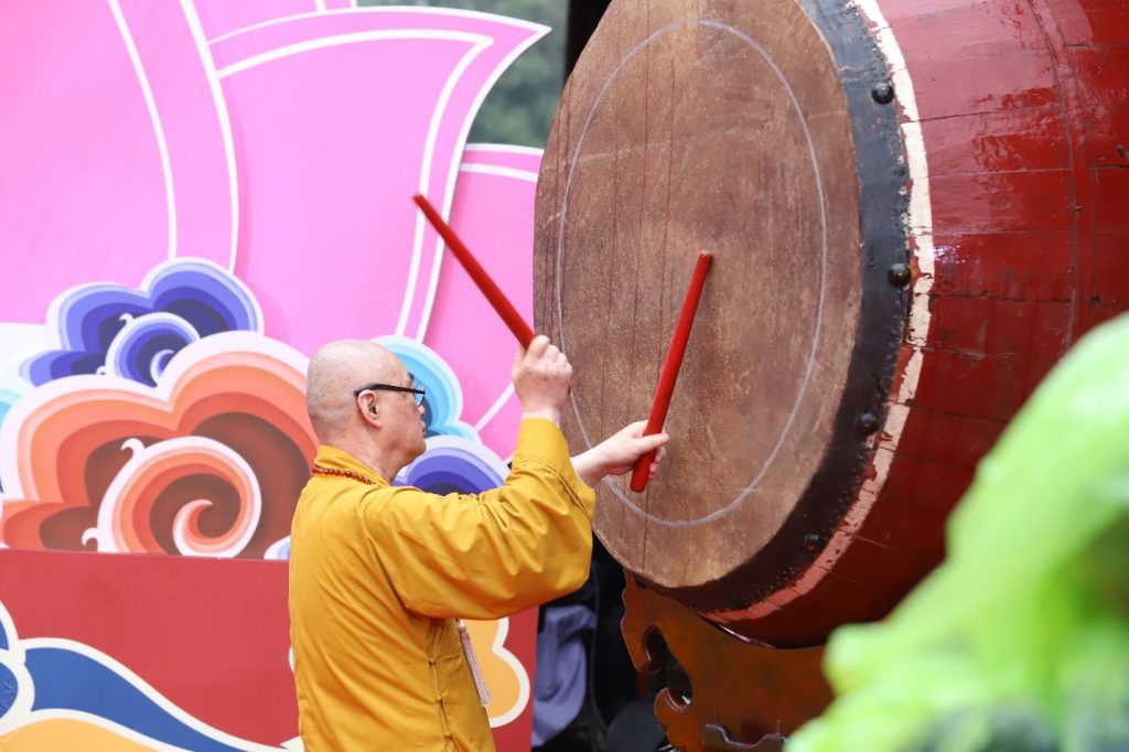 Thượng tọa Thích Minh Hiền thực hiện nghi thức đánh trống khai hội.