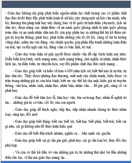 Từ đó, mỗi công dân, đặc biệt là thế hệ trẻ, ngoài việc nuôi dưỡng tâm hồn, rèn luyện tính cách đạo đức, tiếp nhận tri thức thì được giáo dục toàn diện còn giúp mọi người hiểu được giá trị của bản thân, cốt lõi của tinh thần dân tộc, những giá trị nền tảng của đất nước; trở thành những con người vừa hồng, vừa chuyên đảm bảo đủ đức, đủ tài, toàn diện đáp ứng được đầy đủ yêu cầu của xã hội, đất nước. Qua đó, từng bước hiện thực hóa các mục tiêu của Đảng và Nhà nước đã đề ra như mục tiêu “dân giàu, nước mạnh, dân chủ, công bằng, văn minh”…