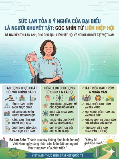 Chia sẻ về sự kiện lần đầu tiên có đại biểu Quốc hội là người khuyết tật do tổ chức đại diện giới thiệu trúng cử, bà Nguyễn Thị Lan Anh, Phó Chủ tịch Liên hiệp hội về người khuyết tật Việt Nam, nhấn mạnh: việc này không chỉ mang ý nghĩa biểu tượng, mà còn tạo ra tác động thực chất đối với quá trình hoạch định chính sách. Khi người trong cuộc trực tiếp tham gia nghị trường, các chính sách liên quan đến tiếp cận, giáo dục, việc làm, an sinh xã hội sẽ có thêm góc nhìn thực tiễn, từ đó nâng cao tính khả thi và hiệu quả triển khai. Điều này phù hợp với xu hướng quốc tế về thúc đẩy sự tham gia của các nhóm yếu thế trong hoạch định chính sách công.