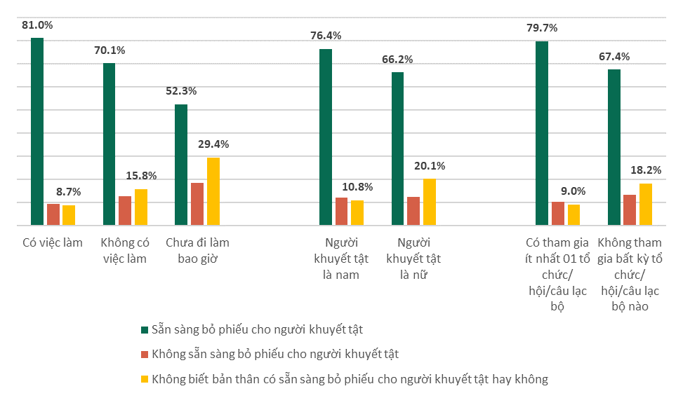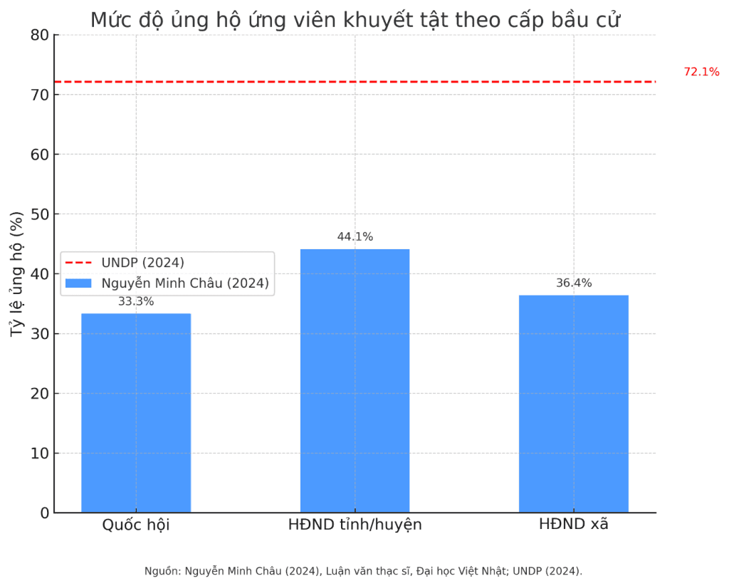 Theo kết quả khảo sát năm 2024 của ThS. Nguyễn Minh Châu và Chương trình Phát triển Liên hợp quốc (UNDP), cộng đồng chính là “người trao cơ hội” cho ứng viên là người khuyết tật. Nghiên cứu của ThS. Nguyễn Minh Châu trên 573 cử tri, gồm cả người khuyết tật và không khuyết tật, cho thấy mức độ ủng hộ có sự khác biệt rõ rệt giữa các cấp bầu cử: 33,3% ở cấp Quốc hội, 44,1% ở cấp Hội đồng nhân dân tỉnh và huyện, và 36,4% ở cấp xã. Trong khi đó, báo cáo của UNDP lại ghi nhận 72,1% cử tri là người khuyết tật sẵn sàng bỏ phiếu cho ứng viên cùng nhóm ở tất cả các cấp chính quyền.