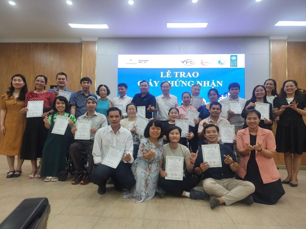 Lễ trao Giấy chứng nhận hoàn thành các nội dung tập huấn theo Chương trình bồi dưỡng kiến thức cơ bản và nâng cao về hệ thống chính trị Việt Nam cho một số NKT lớp miền Nam do Liên hiệp hội về người khuyết tật Việt Nam phối hợp cùng UNDP tổ chức từ năm 2022-2025.