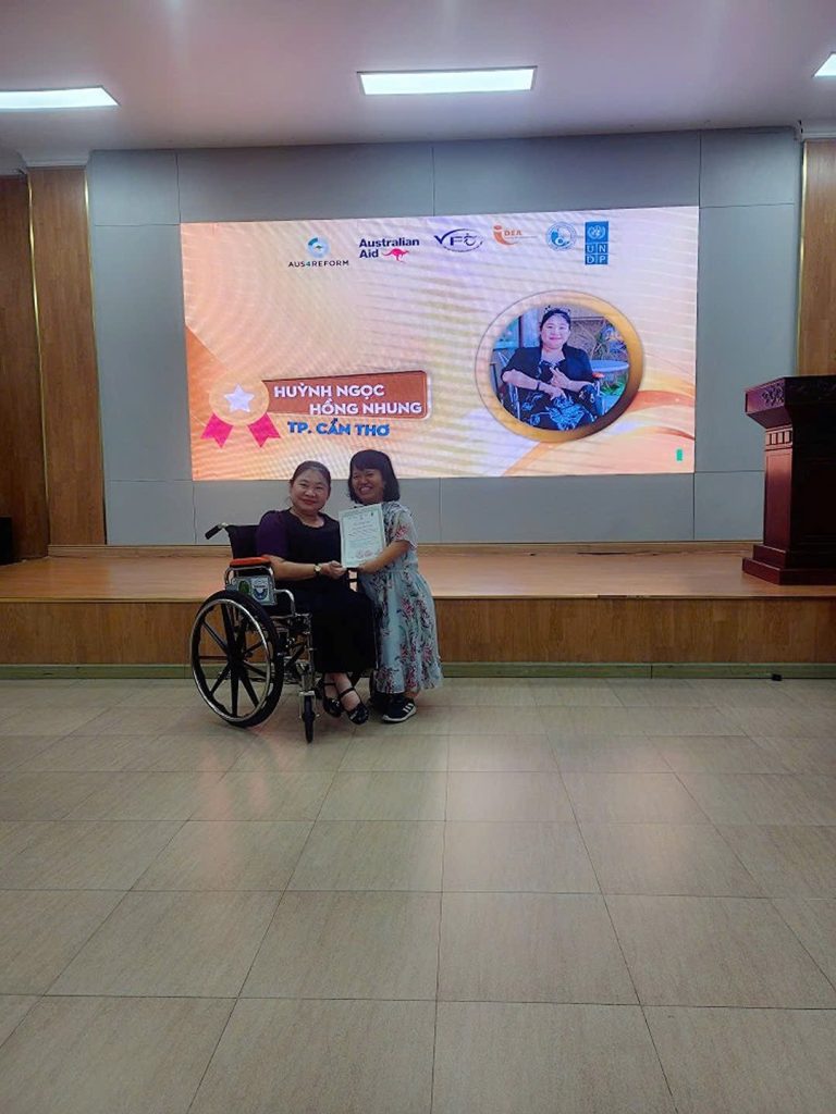 Ths. Huỳnh Ngọc hồng Nhung (ngồi xe lăn) nhận chứng nhận hoàn thành lớp tập huấn nâng cao năng lực, kiến thức pháp luật cho người khuyết tật