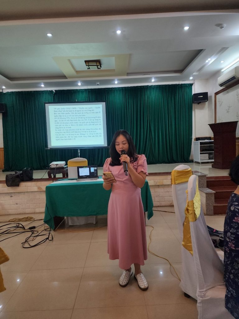 Chị Nông Thị Thiết (cầm míc) phát biểu tại một buổi tập huấn nâng cao năng lực, kiến thức pháp luật cho người khuyết tật