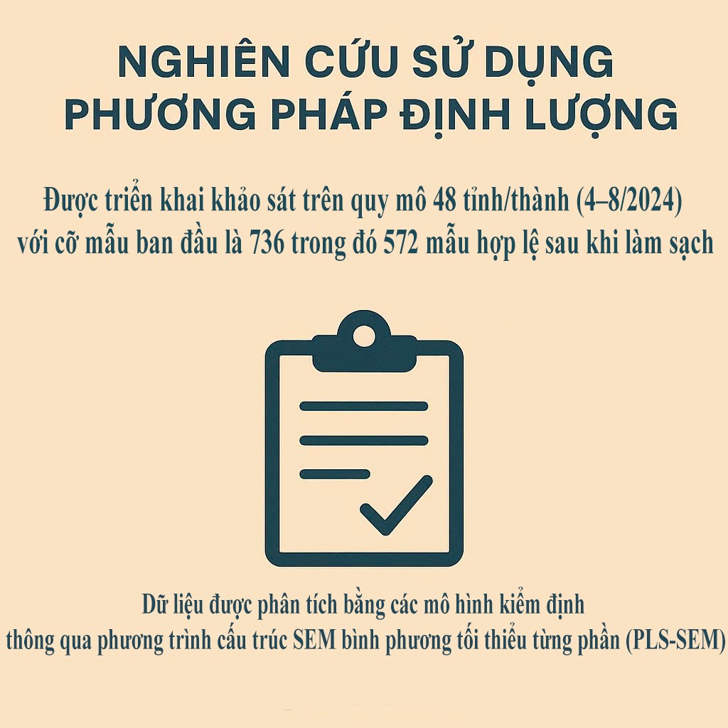 Nghiên cứu được thực hiện từ tháng 4 đến tháng 8 năm 2024, sau 03 vòng thí điểm, tại 48 tỉnh/thành. Cỡ mẫu ban đầu 736 người, mẫu hợp lệ sau làm sạch: 572. Bộ câu hỏi được xây dựng trên cơ sở tổng hợp trên 200 tài liệu pháp luật, nghiên cứu và trường hợp quốc tế, có phỏng vấn sâu các chuyên gia để góp ý cho bảng câu hỏi đảm bảo đo lường đa chiều các cấu trúc ẩn.