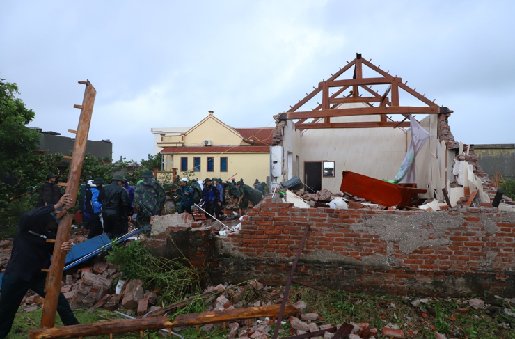 Lực lượng chức năng và bà con nhân dân thu dọn hiện trường hỗ trợ bà con nhân dân khắc phục hậu quả cơn lốc đi qua