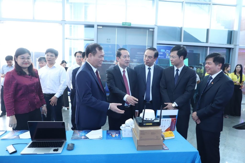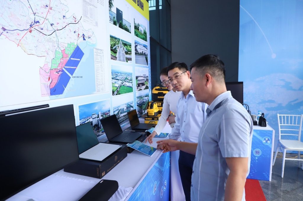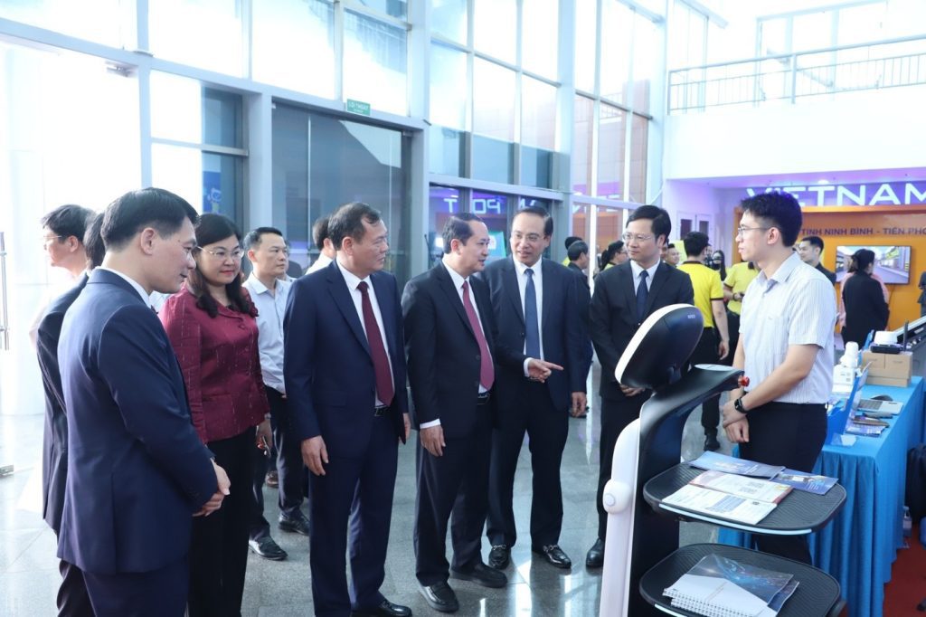 Các đại biểu tham quan gian trưng bày sản phẩm số do các doanh nghiệp trong khu công nghiệp tỉnh Ninh Bình sản xuất.