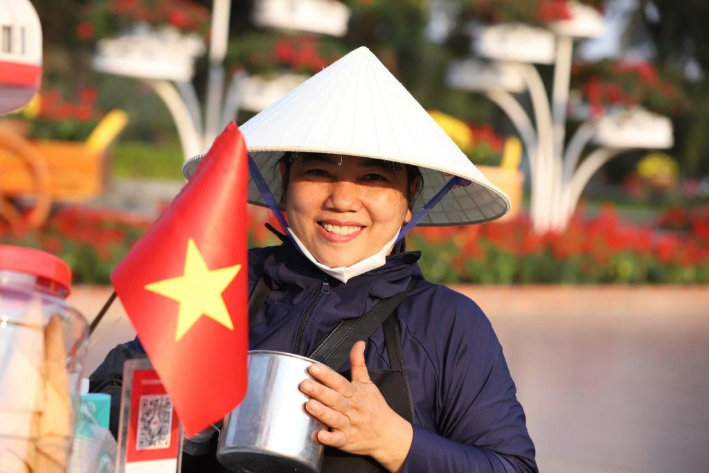 Hình ảnh người dân cầm cờ Tổ quốc chụp ảnh tại khu vực trang trí tuyên truyền góp phần tạo nên không khí phấn khởi trước ngày bầu cử.