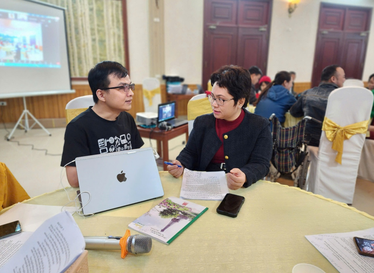Một khung cảnh tiêu biểu của lớp tập huấn “Luật Bầu cử và Kỹ năng thuyết trình, giao tiếp cơ bản” dành cho NKT. Hai đại diện thực hành điều hành một buổi truyền thông chính sách
