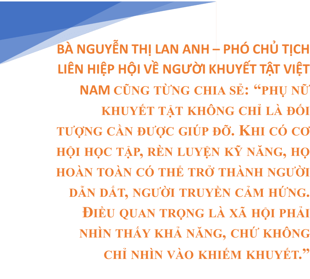 Khi những rào cản ấy dần được gỡ bỏ, phụ nữ khuyết tật không chỉ là những người thụ hưởng chính sách, mà còn có thể trở thành những nhân tố tích cực trong sự phát triển chung của xã hội.