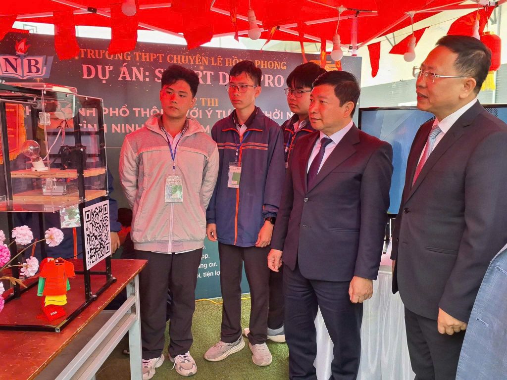 Tham quan các gian hàng, đồng chí Nguyễn Tiến Dũng – Giám đốc Sở Giáo dục và Đào tạo tỉnh Ninh Bình đánh giá cao tinh thần sáng tạo, sự tự tin và khả năng vận dụng kiến thức vào thực tiễn của học sinh. Đồng chí nhấn mạnh, giáo dục khởi nghiệp cần gắn chặt với đời sống, giúp học sinh hình thành tư duy sáng tạo, kỹ năng thực hành và ý thức tạo ra giá trị cho cộng đồng.