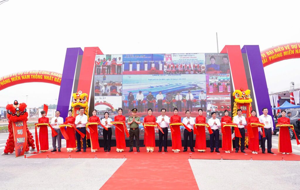 Các đại biểu cắt băng khánh thành Dự án đường Vành đai V, vùng Thủ đô Hà Nội – đoạn tuyến đi qua Thành phố Phổ Yên và huyện Phú Bình.