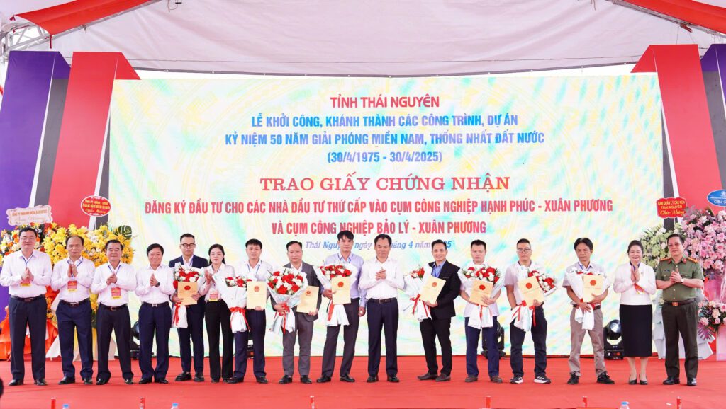 Nhân dịp này, tỉnh Thái Nguyên cũng đồng thời trao Giấy chứng nhận đăng ký đầu tư cho 8 nhà đầu tư thứ cấp vào Cụm công nghiệp Hạnh Phúc – Xuân Phương và Cụm công nghiệp Bảo Lý – Xuân Phương.