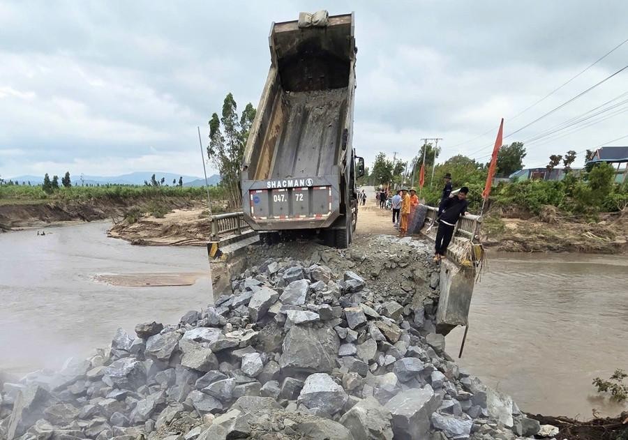 Các lực lượng chức năng tập trung sửa chữa cầu hư hỏng do bão 13 gây ra tại xã Pờ Tó